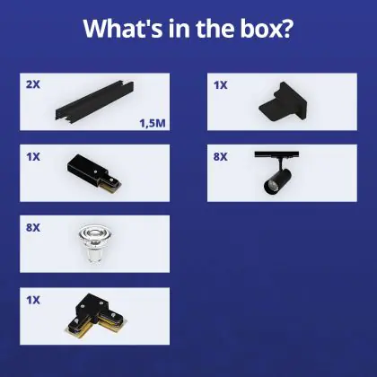 | Fabrikantnaam | Complete L shaped 1-Phase Track Set Black incl. 8x Spot fixture + GU10 2700K 3W Dim – 1,5 x 1,5 mete | |