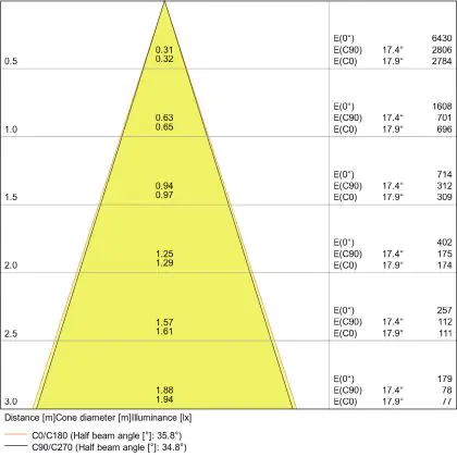 De lichtopbrengst en de gradenbundel spelen een grote rol. Zo geeft de lichtopbrengst van 650 Lumen in combinatie met de 40° stralingshoek deze inbouwspot een specifieke toepassing. Kort samengevat is een lichtintensiteit van maximaal 400 Lumen ideaal voor accentverlichting, terwijl hogere waardes goed gebruikt kunnen worden als basisverlichting. Over het algemeen geldt: hoe breder de gradenbundel, hoe geschikter deze is door basisverlichting. Dit komt doordat het licht over een groter oppervlak wordt verspreid. Smallere gradenbundels (tot 40°) kunnen echter bij hoge plafonds ook goed tot hun recht komen als algemene verlichting.