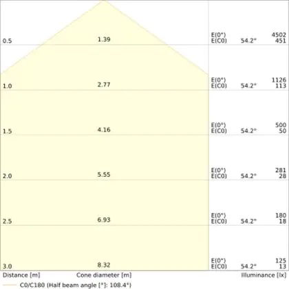 De gradenbundel geeft informatie over hoe breed het licht wordt uitgestraald. Dit zit tussen de 0 en 360 graden (D). Hoe kleiner de hoek, hoe specifieker de lichtbundel is. Over het algemeen is een smalle gradenbundel perfect voor sfeer- of accentverlichting, terwijl een brede gradenbundel ideaal is om grote oppervlaktes te verlichten.