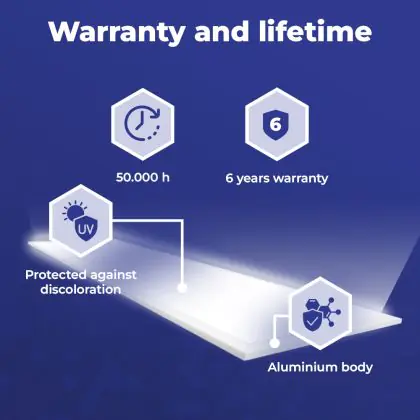 Met de aanschaf van dit LED paneel van 120x30cm maak je in meerdere opzichten een goede keuze. Met een gemiddelde levensduur van 50000 uur ben je verzekerd van een duurzaam product, dat vele jaren optimaal blijft presteren. Bovendien draag je een steentje bij aan een schoner milieu, want LED verlichting vermindert de C02 uitstoot en bevat geen giftige stoffen zoals kwik.
